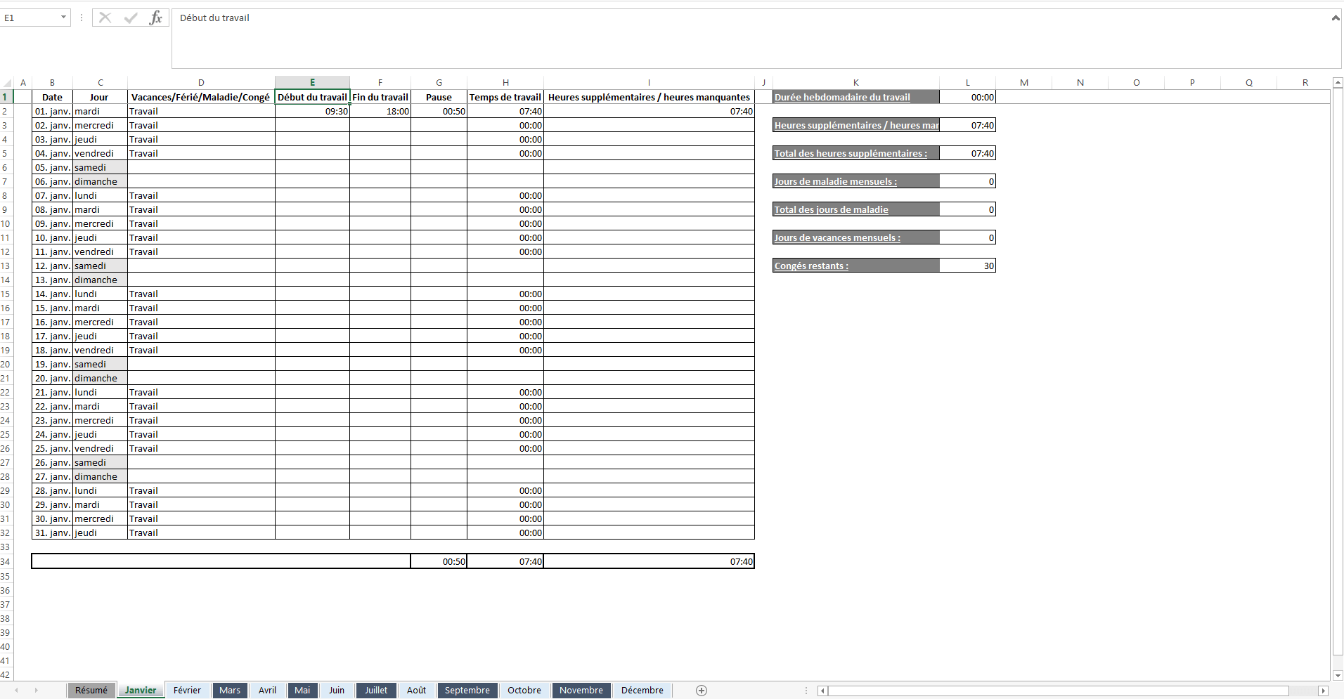 De toute façon, vous pouvez demander au document Excel de calculer les heures de travail effectives de votre salarié entièrement automatiquement :