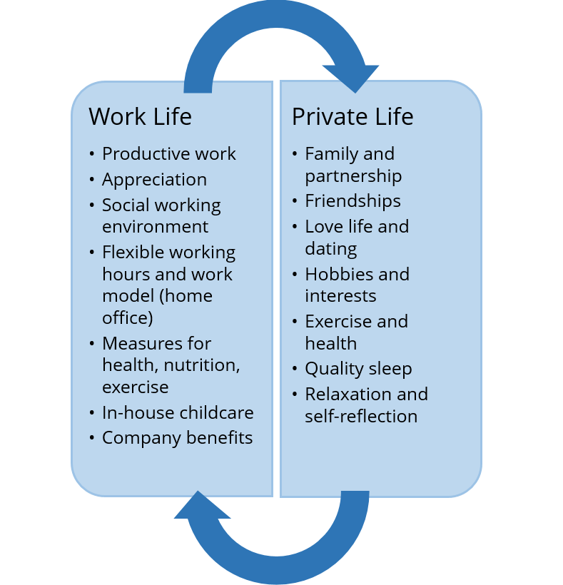 Beaucoup des facteurs énumérés ci-dessous peuvent également fonctionner ensemble à travers les catégories (par exemple, les facteurs « environnement social de travail » dans la vie professionnelle et « amis » dans la vie privée sont souvent confondus). En outre, il devrait être clair que les besoins dans les différents domaines de la vie évoluent de façon spécifique pour chacun. Alors qu’un employé accorde une grande valeur aux loisirs et aux intérêts personnels, mais n’a pas pour ambition de fonder une famille, il suffit à un autre de pouvoir passer suffisamment de temps avec sa famille pour une vie privée satisfaisante.