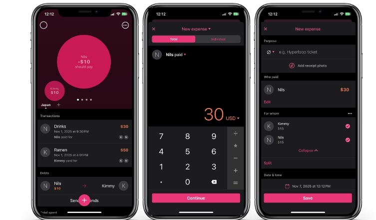 Splitwise organise les dépenses au sein de groupes. Vous pouvez ajouter d’autres membres à l’aide de leur numéro de téléphone ou de leur adresse email, afin qu’ils disposent d’un accès direct. Ce fonctionnement est essentiel, car un groupe ne peut être maintenu durablement que si chaque personne est en mesure de gérer ses propres dépenses et transactions.