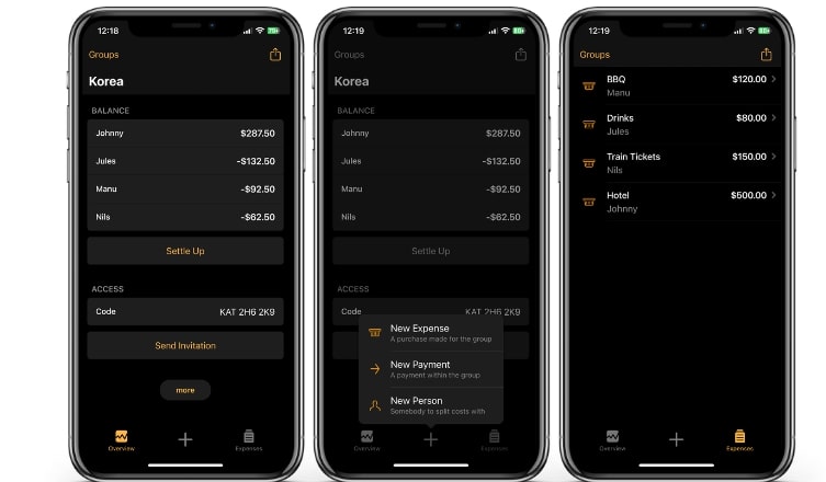 Face à la concurrence, Settle Up (Android et iOS) se distingue par un design en bulles qui affiche les différentes personnes du groupe avec un solde individuel clairement visible. En dessous, une timeline récapitule les régularisations effectuées ainsi que les actions encore nécessaires pour équilibrer les comptes. Avec cette application de partage des frais, vous pouvez répartir et pondérer les dépenses, mais aussi valider directement des paiements avec un ami. Si vous êtes la seule personne à utiliser l’application pour gérer les dépenses, il n’est pas nécessaire d’inviter les autres membres sur Settle Up. Il reste toutefois possible de partager le groupe via un simple lien.