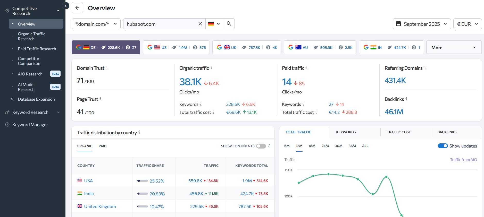 SE Ranking combine des estimations de trafic avec des données sur les mots-clés et les backlinks, offrant une vue claire sur la manière dont un site Web attire ses visiteurs. Grâce aux tendances et aux comparaisons concurrentielles, cet outil constitue une excellente solution pour une analyse rapide du marché, même si les rapports détaillés sont réservés à la version payante.