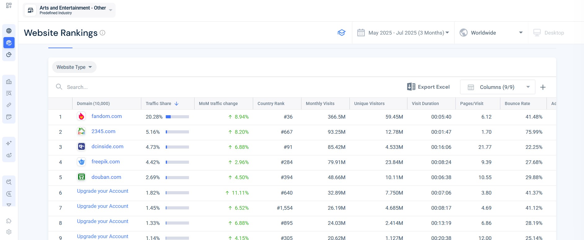 SimilarWeb ne fournit pas toujours des données parfaitement précises, mais cet outil d’analyse de trafic offre un aperçu fiable et une visualisation claire des sources de trafic. La fonction Top Websites Ranking est idéale pour repérer en quelques clics les sites Web les plus performants d’un secteur.