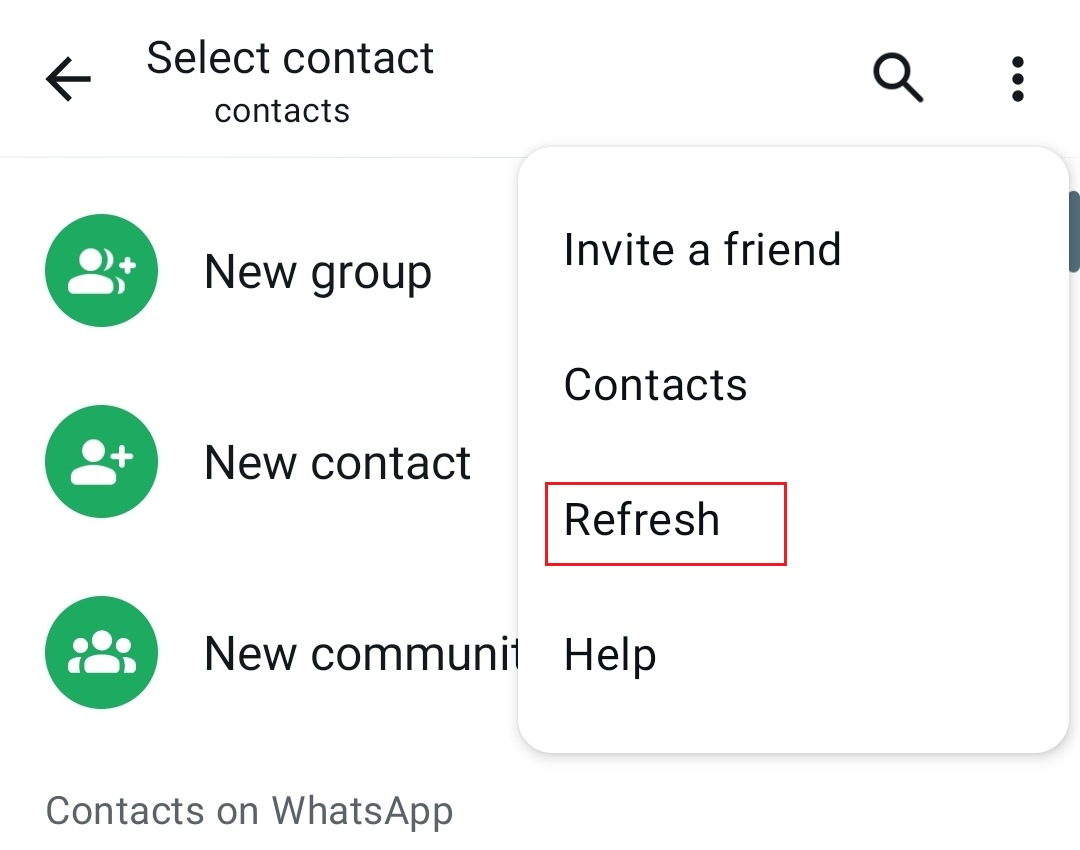 - Mettre à jour la liste de contacts : ouvrez WhatsApp, appuyez sur le menu à trois points puis sélectionnez « Mettre à jour ».