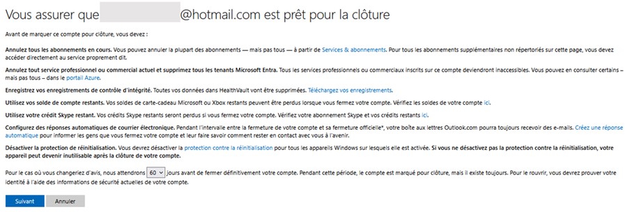 Votre compte Microsoft sera d’abord désactivé. Lors de la demande de suppression, vous pouvez choisir si le compte doit être définitivement supprimé après 30 ou 60 jours. Cela signifie que vous pouvez toujours accéder à vos données pendant cette période et réactiver le compte. Pour ce faire, connectez-vous simplement avec vos identifiants Microsoft et suivez les instructions pour réactiver le compte.
